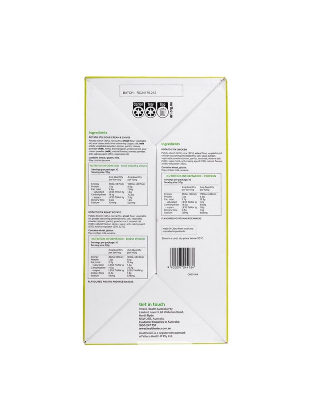 Immerse yourself in the delicious and satisfying crunch of Healtheries Potato Stix Multipack! With 30 convenient packs, you can snack on our crispy, gluten-free potato sticks anytime and anywhere. Made with real potatoes, these snacks are a healthier and tastier alternative to traditional chips. Fuel your cravings with Healtheries Potato Stix Multipack.